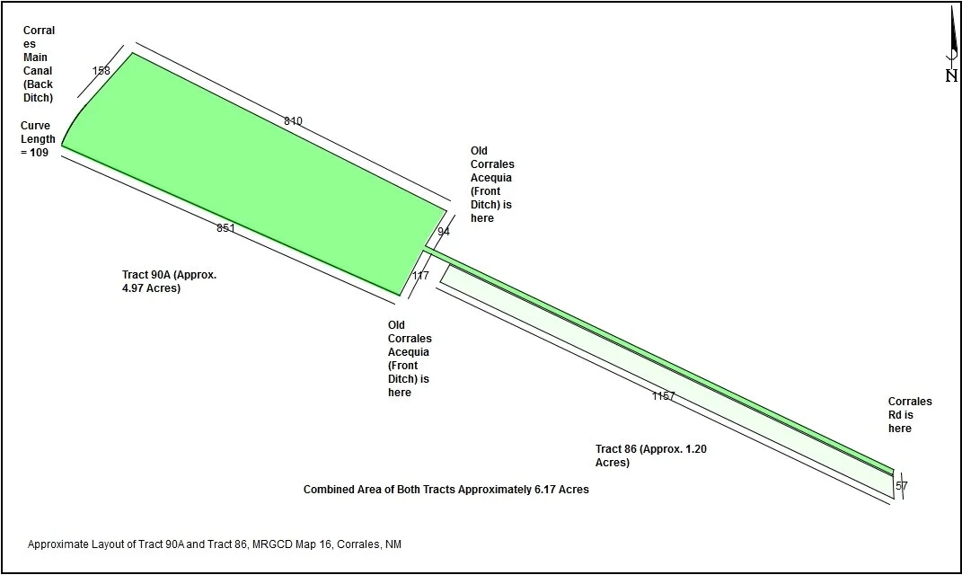 Two tracts: MRGCD Map 16, Tract 90A (4.7+ Ac. — 383 Kent Lane), plus MRGCD Map 16, Tract 86 (1.3 Ac. — 5831 Corrales Road — which serves as wider roadway access from Corrales Rd). See MRGCD map excerpt below. Both parcels together only.